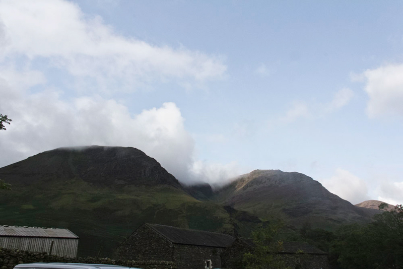 Pointing over the farm buildings Grizzly said, "There are the three Wainwrights. From the left High Crag, High Stile and distantly Red Pike."