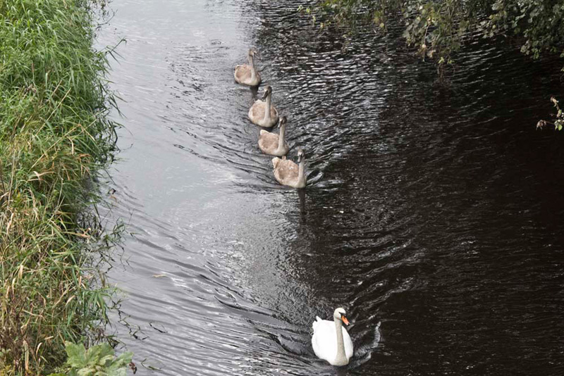 Dad strode on, only to be halted on the bridge, seeing this swan with cygnets line astern.