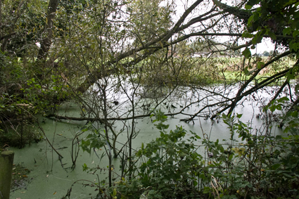 Here a waymark indicated we should go ahead on the narrow grassy path between hedges and past this pool...