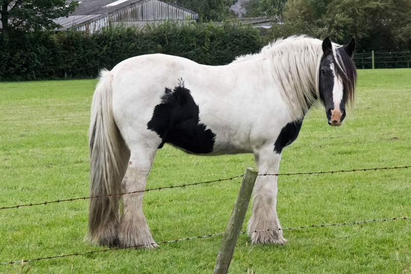 Before the facing fence the route was clearly right over a bridge, to follow the stiled way with Wheel Foot Watercourse to our left. This horse being in the field beyond.