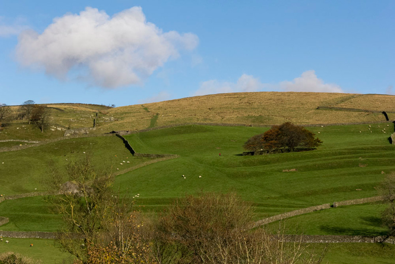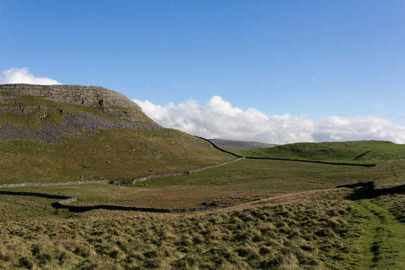 The path climbed by the substantial stone wall, the limestone scars to the left etched sharply against the clear blue sky.
