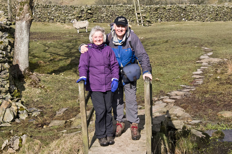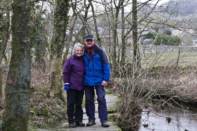 Eventually the descent levelled as we crossed a farm access, then over a facing stile and across more pasture. At a pretty footbridge, a stop was made for pictures, and here is Dad with Aunt Pat.