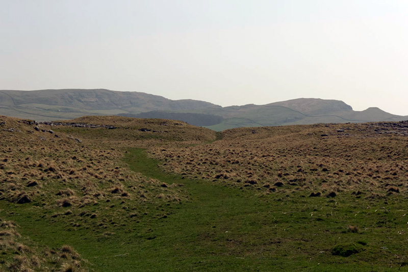 Then in a few steps, climbed the stone step stile over the wall and so on up to the ladderstile on the skyline. Beyond walked the wide green path. It led on and on below the ridge of Smearsett Scar to the left. After another ladderstile and then a gate, the path now by the wall on the right led to a ladderstile onto the track a Feizor Nick.