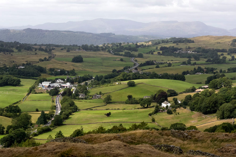 The A591 can be seen winding its way first through the village of Ings and them on towards Windermere. The misty mountains in the distance are the Coniston fells.