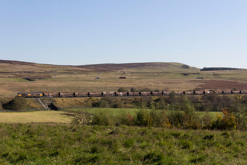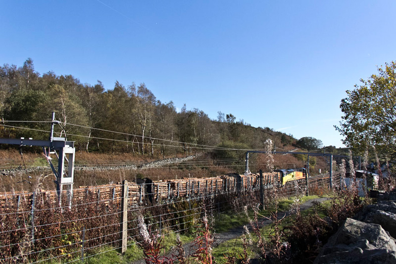 The excitement over we now walked on pass over a stile still close to the railway. And to round off the railway interest in this walk we saw a long log train heading south.