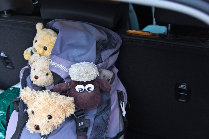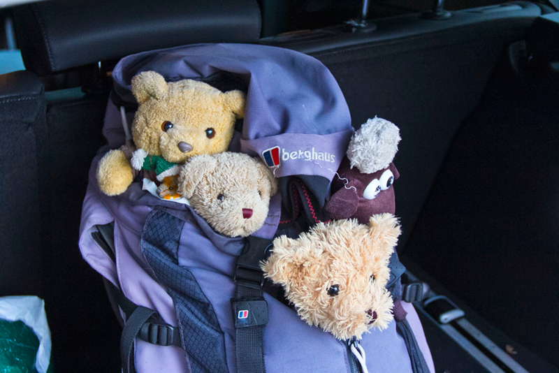There had been nowhere suitable to take our picture, but we always have to appear in the story. So Dad took these of us tucked in the rucksack. Two different angles to ensure that Grizzly and Little Eric are in view.