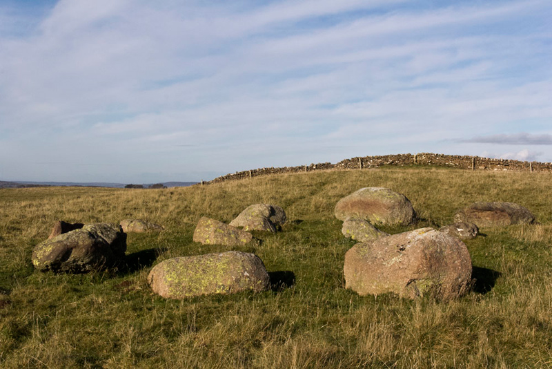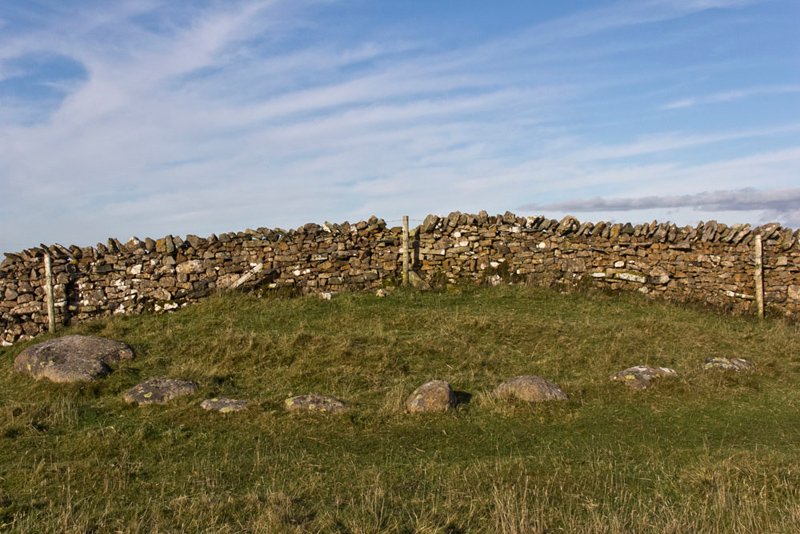 30m up the slope to the right is the first of two stone circles. This is Iron Hill Cairn Circle north. The stones are of Shap granite except the one on the right that is limestone. Once there were others on the far side of the wall but these have been lost.