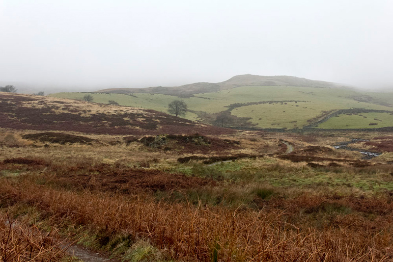 Now on and on through gates with sections of the track walled then open on all sides across moorland, finally snaking down to Park Beck running across in front of the wall seen in the distance below. Here we should have been able to enjoy fine views of the Kentmere Fells, but they were being shy today, lost in the low cloud.