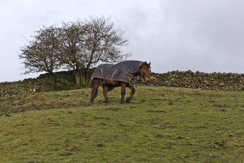 Beyond the route was well waymarked. Across the large pasture where there were more horses that again paid us no heed and just went to join their friends by the gate. One that was young ran down, whereas this one just plodded slowly.