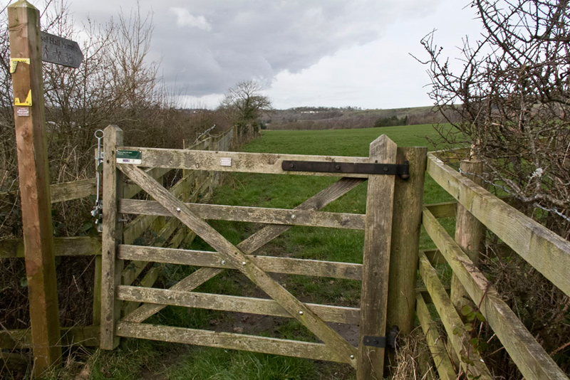 Part way down the drive, Shaun said, "it's through this waymarked gate to the left. Then we go diagonally right across the pasture to next gate, and then on by fence on the right to next gate."