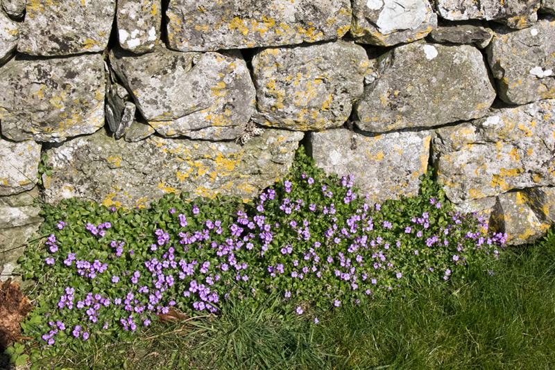 At the bottom of the hill, a gate gives access to the hamlet with its pretty stone houses. By a wall these flowers gave a splash of spring colour...