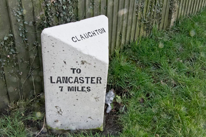 Now in Claughton, Little Eric in 2022, called out, "look there is the restored milestone for this village. We have walked a mile from the one in Caton."