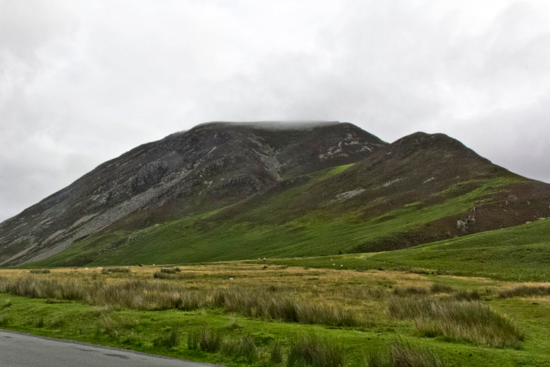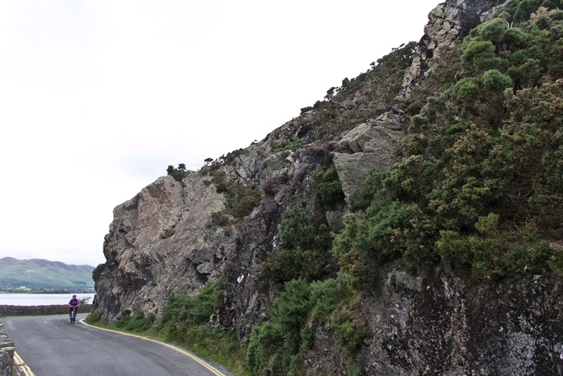 The road hugs the lake with a steep sided drop to the shore, so here there was no option other than to walk carefully by the road. Mellbreak dominates the view across the the lake.