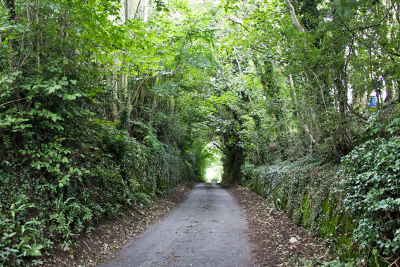The grassy hedged track that was lined with bluebells, on the day in May 2022...