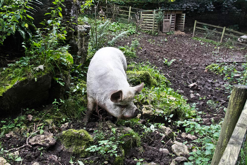 This led into woods, then out to a huge pasture, where by a gate right was an enclosure for two pigs. On the September day one ambled over.
