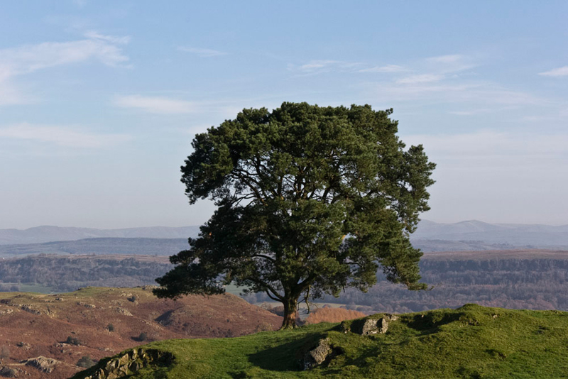 A stile took us to open ground and we followed the path as it bent right past this prominent Scots Pine.