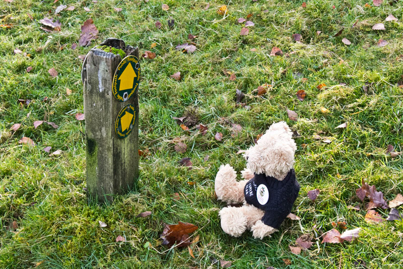 The leaf strewn path climbed to a gate, where the waymark pointed us left across the field. Here there was a very considerate bear sized waymarker, as illustrated by Southey.