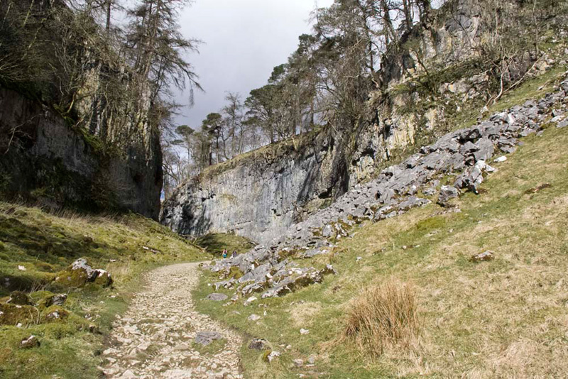 Here the tall limestone cliffs close in on either side allowing just a steep narrow scramble to the path beyond.