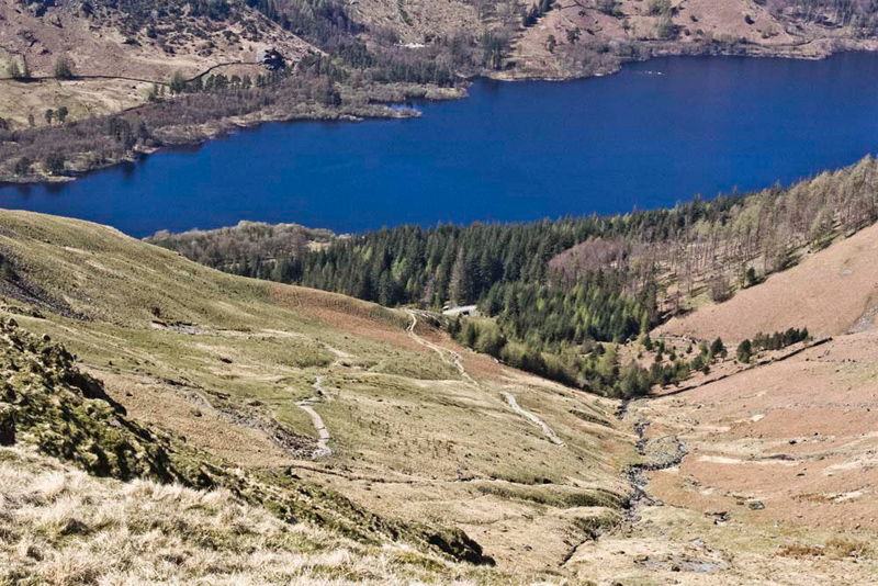 Dad was now faced with a long arduous and at times steep descent via Birk Side that took in all about and hour and a quarter. The first section involved sweeping zigzags, as Thirlmere came into view.