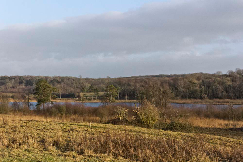A stile gave access to fields, Allen pointing, "finally there is a reasonable view of Hawes Water, even of still partly hidden by the surrounding trees."