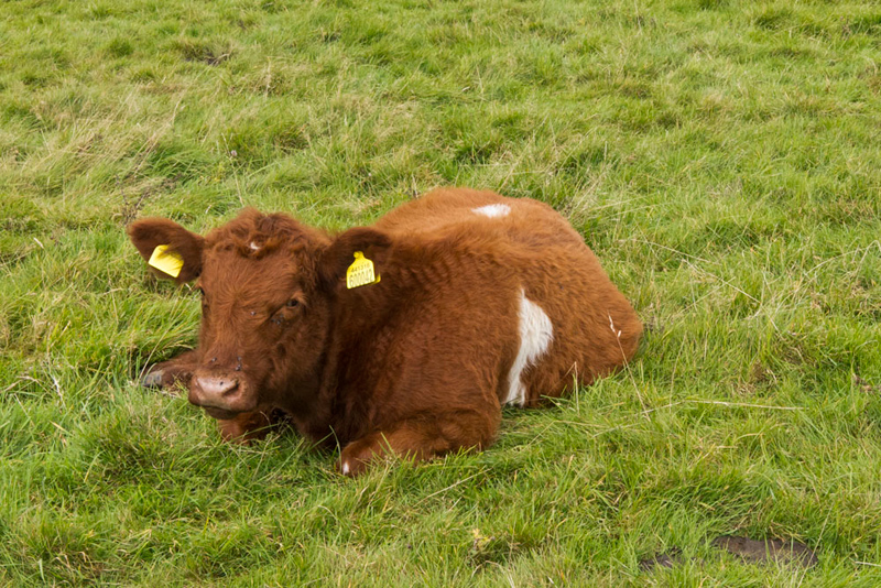 "Aww, look at the calf lying down", pointed Little Eric.