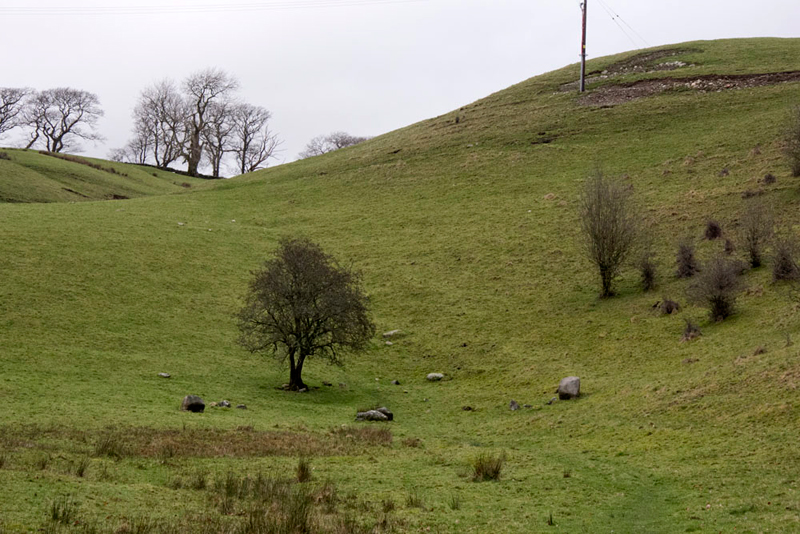 After the steep climb up grassy slope over the shoulder of the hill, Shaun called out, "it's ahead keeping to the right of the small stream."