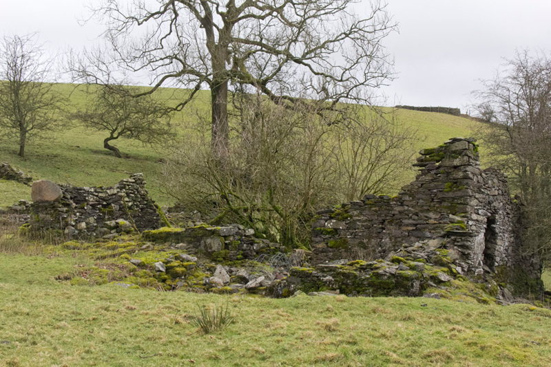 Coming to a wall corner the path led on by the hedge and over a stile to come to the sad remains of Littlemire Farm. Grizzly said, "it was abandoned in 1940s."