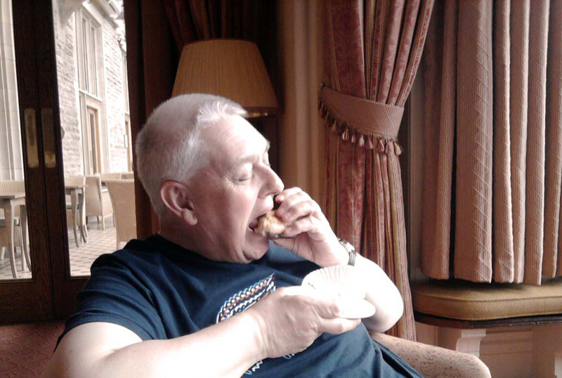 So then they just settled down to enjoy the food, taking their time. Quite often some people are unable to finish it all, but not Dad and Uncle Brian, and not a morsel was left at the end. One of the cakes was a chocolate eclair, which rather unflatteringly Uncle Brian, snapped Dad eating. I suppose the expression on his face could be described as one of ecstasy!