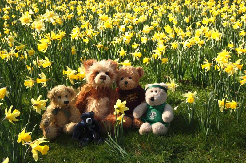 Crossing in front of the hotel, we now set off on the Nature Trail. We did not get very far, indeed only to the side of the building, where Polly called out, "just look at that wonderful host of daffodils. It would make a nice picture, with us sitting amongst them."