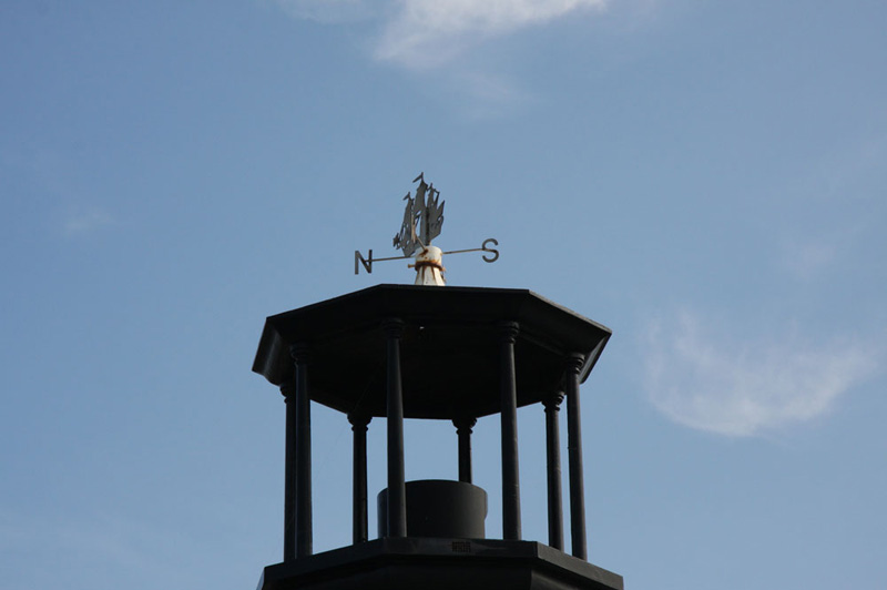 A close up, revealed it is topped by a wind direction indicator in the shape of a sailing ship.