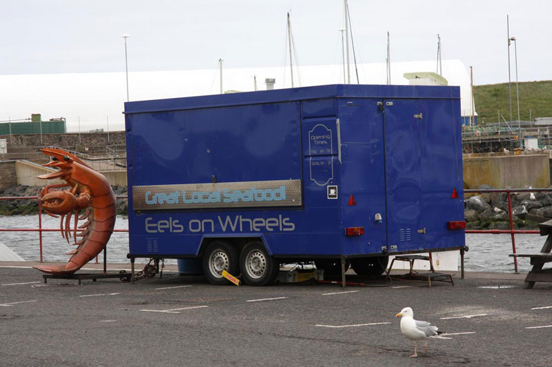 It was May, but that really was in name only, as there was a strong wind making the already unseasonably low temperatures feel like winter. By the time we had got to the opposite side, poor Uncle Brian was thoroughly chilled through, and pretty miserable into the bargain. He was not relishing at all the thought of having to ride back, but thankfully there was parking on this side, so Dad kindly walked swiftly back and brought the car round. Much to Uncle Brian's relief, he was able to get in and warm up. We still wanted to do some exploring, so walked on along the harbour, where we spotted this mobile van selling sea food. It was the name that really amused us.