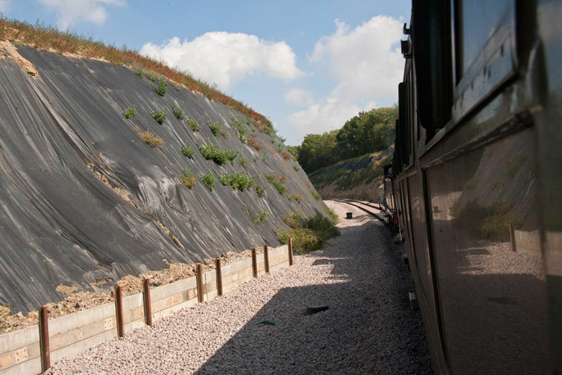 Here we are in the cutting, the height giving some idea of the scale of the task faced by the railway. The black plastic covering the side of the cutting will disappear next year as nature takes over and vegetation grows through.