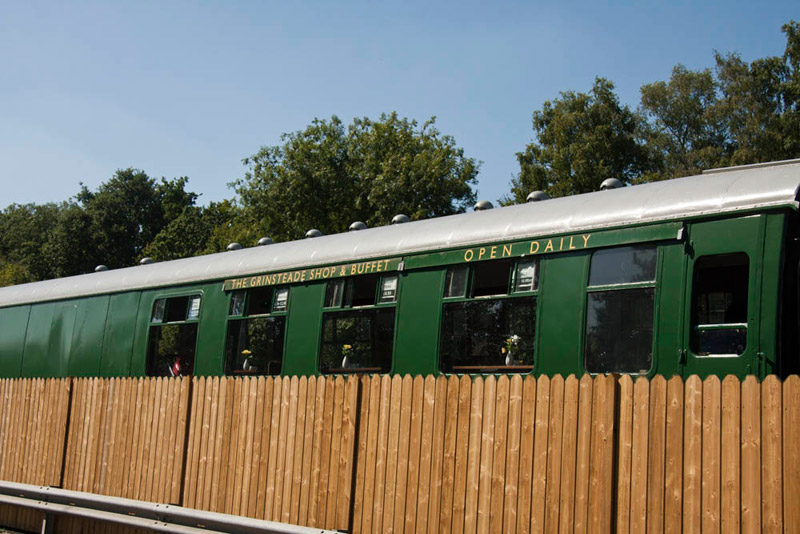 Refreshment facilities are provided in a converted railway carriage, known as 'The Grinsteade Buffet & Shop'. This shot is taken from outside the station and shows the sign boards that were installed while we were there. This is to bring it to the attention of the general public who are not using the railway. In the winter time trains will only run at weekends, but the staff are intending to keep the buffet open every day. We hope that this sign will encourage people to use it!