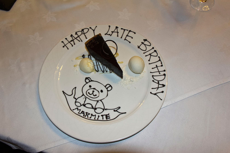 Well a lovely meal was enjoyed. For dessert they both chose the scrumptious, dark chocolate tart with white chocolate sorbet. We know this because it is what most of us had too. Dad's arrived on a decorated plate, to celebrate his birthday and Marmite joining the Hug...