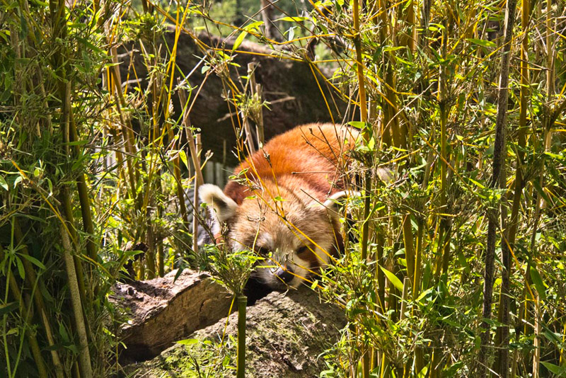 Adjacent are the Red Panda that is a  domestic cat-sized mammal. It has previously been classified with raccoons, bears and mustelids but has been found to be the only living species of the genus Ailurus and the family Ailuridae. They have partially retractable claws and an extended bone which is similar to a 'thumb', that  makes them extremely good climbers. With red panda being found in colder climates they have fur on the soles of their feet which helps them remain warm in high altitudes where they dwell.