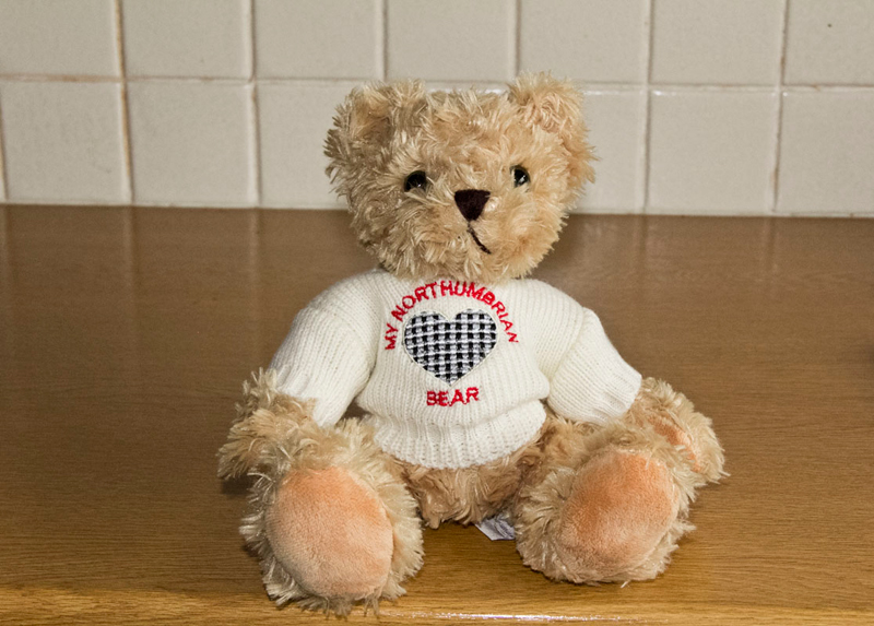 The heart shaped design on his sweater is the Northumbrian Tartan. This was worn by shepherds in the county well into the 20th century as  a warm working garment. A fragment of the check has been dated as far back as  263 A.D.  Since 1760, the plaid has been  the official dress of the Duke of Northumberland’s piper.