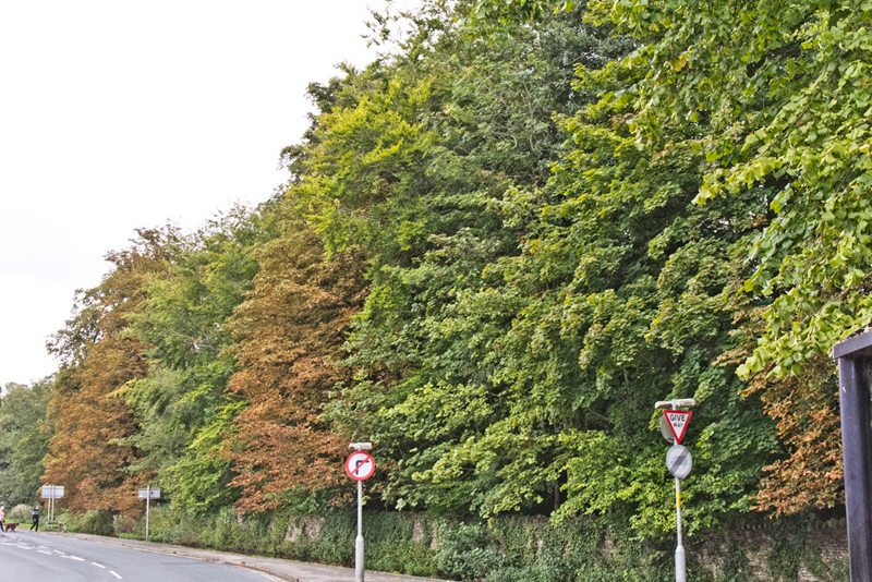 It was decided to explore the road running from the green, with these beautiful mature trees behind the wall.