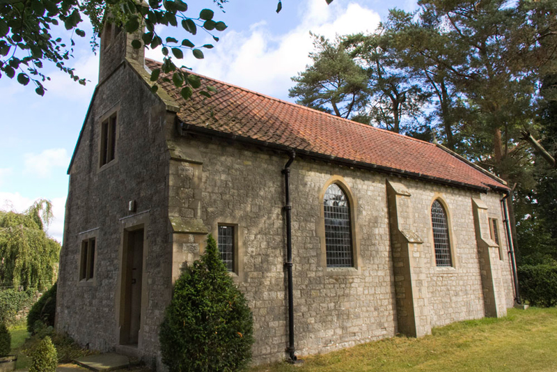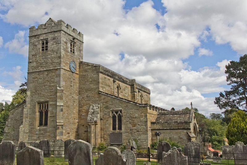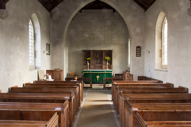 "The building is very simple, the major feature being the extremely high chancel arch. One oddity is that there is no east window, which is very unusual in an Anglican church. The oak pews were brought here from All Saints Church in Kirkbymoorside. The altar rails came from a stately home, Douthwaite Hall, an 18th century country house a mile outside the village.