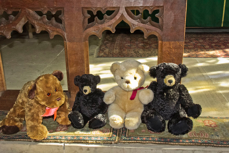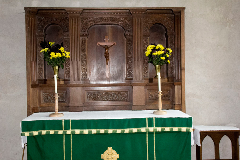 The altar is wooden but is topped with a stone altar table, or mensa. Behind is a very good oak reredos brought here from Welburn Hall near Kirkbymoorside."