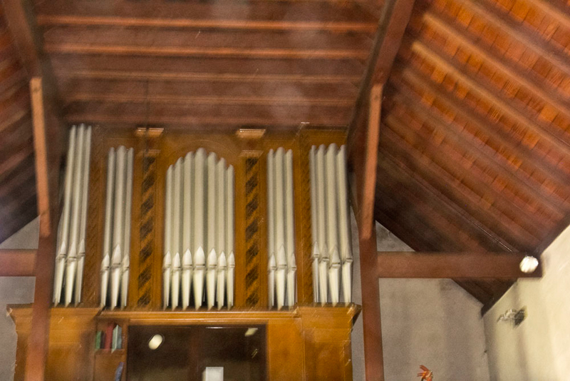 Pointing to the west end, Byron went on, "that organ is probably the oldest furnishing, being built in the 1860s and coming from a Methodist chapel near Scarborough, but probably began as a chamber organ in a country house." [bit out of focus - sorry! Little bit of camera shake by Dad].