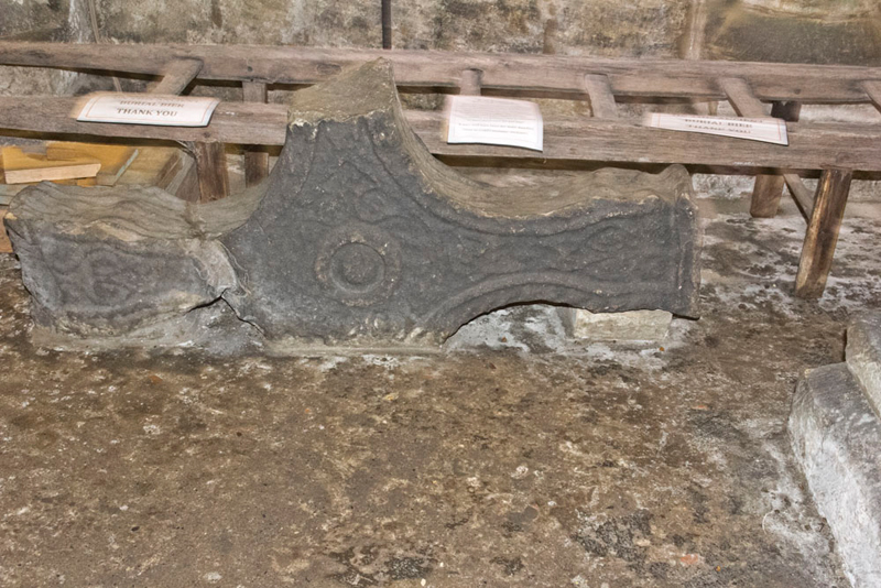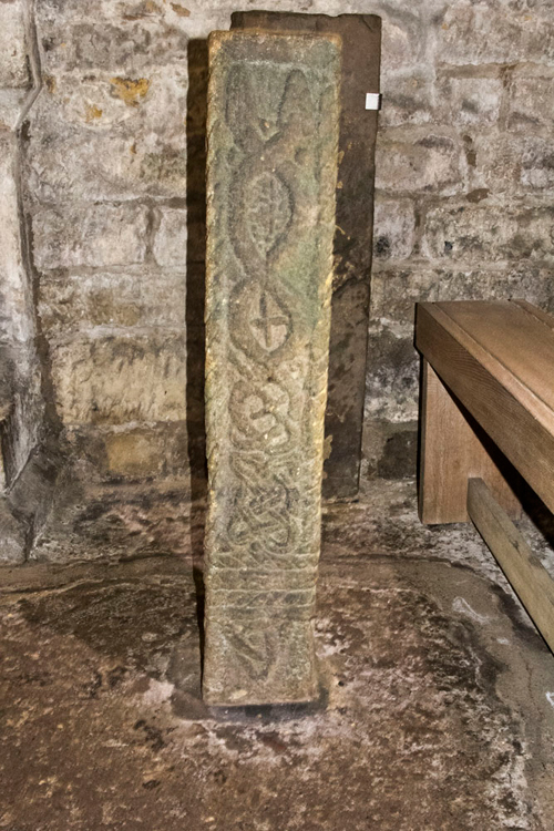 Exploring Luke pointed to this ancient cross shaft, and read the information sheet. "This dates from the 10th century. Both sides of the cross shaft have an interwoven Viking design, but also the 'key' design of the late Saxon crosses. This suggests that the monastery did not remain deserted, but survived the Danish conquest."